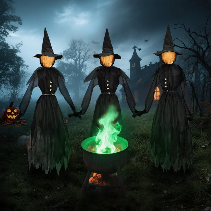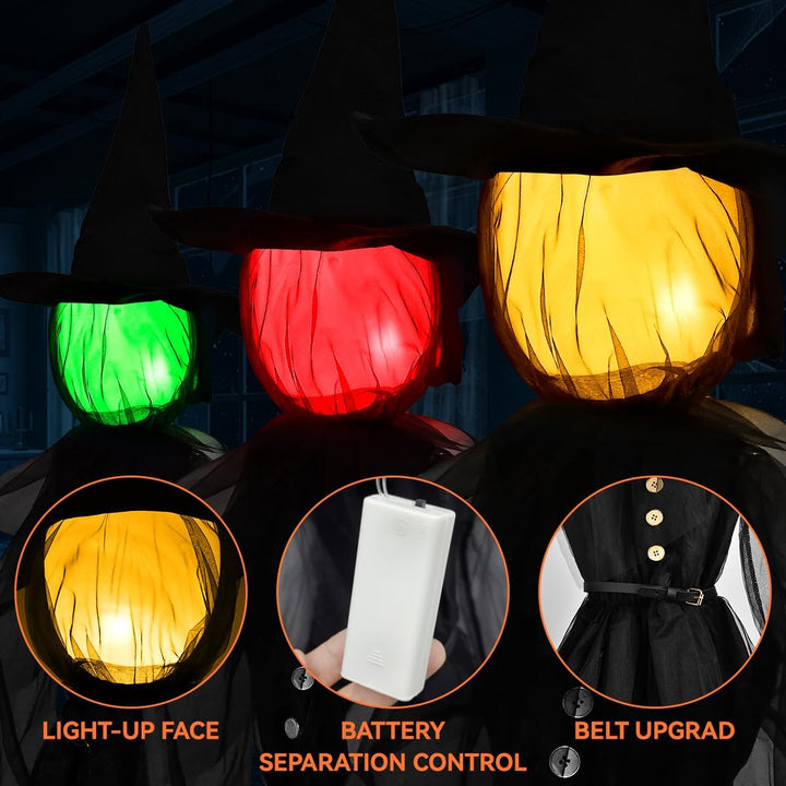 Each witch features built-in multicolored LED lights that cast an otherworldly glow—perfect for creating a haunted ambiance during nighttime trick-or-treating or Halloween parties. Whether placed in your front yard, garden, or under a tree, this eerie trio instantly becomes the focal point of your spooky setup.