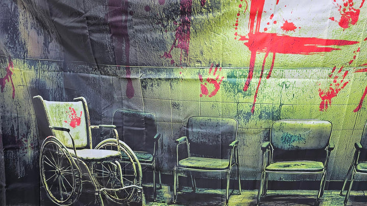 Transform your garage into a spine-chilling scene with this 16 x 7 ft Halloween door cover! Featuring a scary, bloody wheelchair design, it sets the perfect haunted vibe for your yard. Easy to hang and weather-resistant, this spooky backdrop is sure to thrill trick-or-treaters and guests alike with its eerie, horror-night feel. Make your Halloween unforgettable with this eye-catching outdoor decoration!