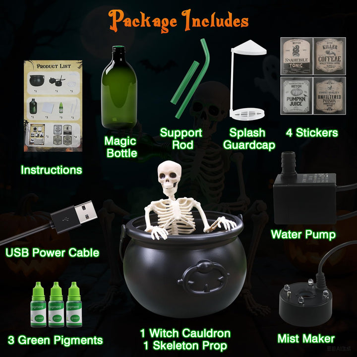 Bring spooky charm to your Halloween party with this Cauldron Decor featuring a skeleton, magic floating potion bottles, and a fog maker. Perfect for your home table, this black witch's cauldron creates an enchanting, eerie atmosphere that captivates guests. Its floating bottles add a touch of magic, while the fog maker fills the air with mysterious mist, making your indoor decorations unforgettable. Get ready for a bewitching celebration!